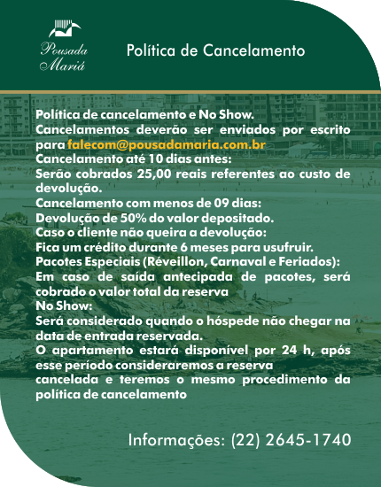 Contatos: 55 22 2643-3940 ou 22 2645.1740 Email: falecom@pousadamaria.com.br Endereço: Rua Jorge Lóssio, nº 899 Centro, Cabo Frio - Rio de Janeiro, 28907-012 |